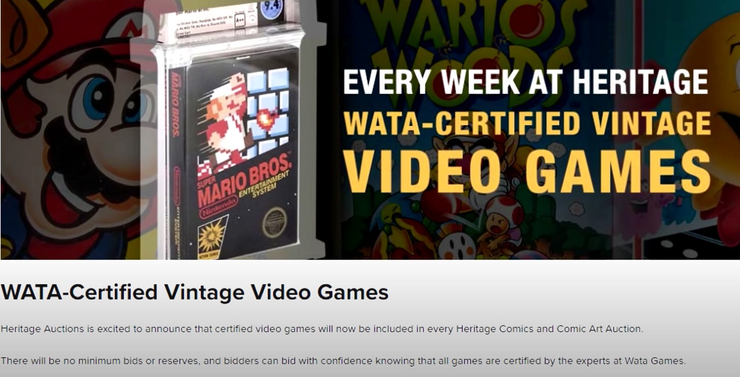 Disclaimer: None of the content above is intended as investment advice. The author is an attorney and journalist and gamer, not a financial adviser. While he has purchased sealed and graded NES games in the past and may do so again, he is not an investor in such games and has never sold—or sought to sell—such games to anyone at any time. This author on one occasion purchased an item through Heritage Auctions, and it was a seamless and unremarkable transaction.