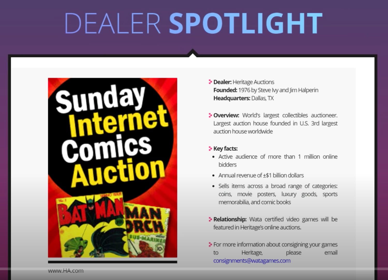 As the Jobst Report details, after overpaying Bronty by as much as $70,000—albeit at a time Bronty was owed cash for the downgrading of his game, and its use as a valuable marketing commodity by WATA for almost a year (Business Insider termed it a nine-month “promotional run”)—Halperin immediately advertised the sale on the Heritage Auctions website, where he teased that the video game “just might” appear in a future Heritage auction. He also used the opportunity of this new attention on his auction house and WATA—a coincidence few readers could have missed—to boast of Heritage Auctions’ upcoming first-ever WATA-themed video game auction.