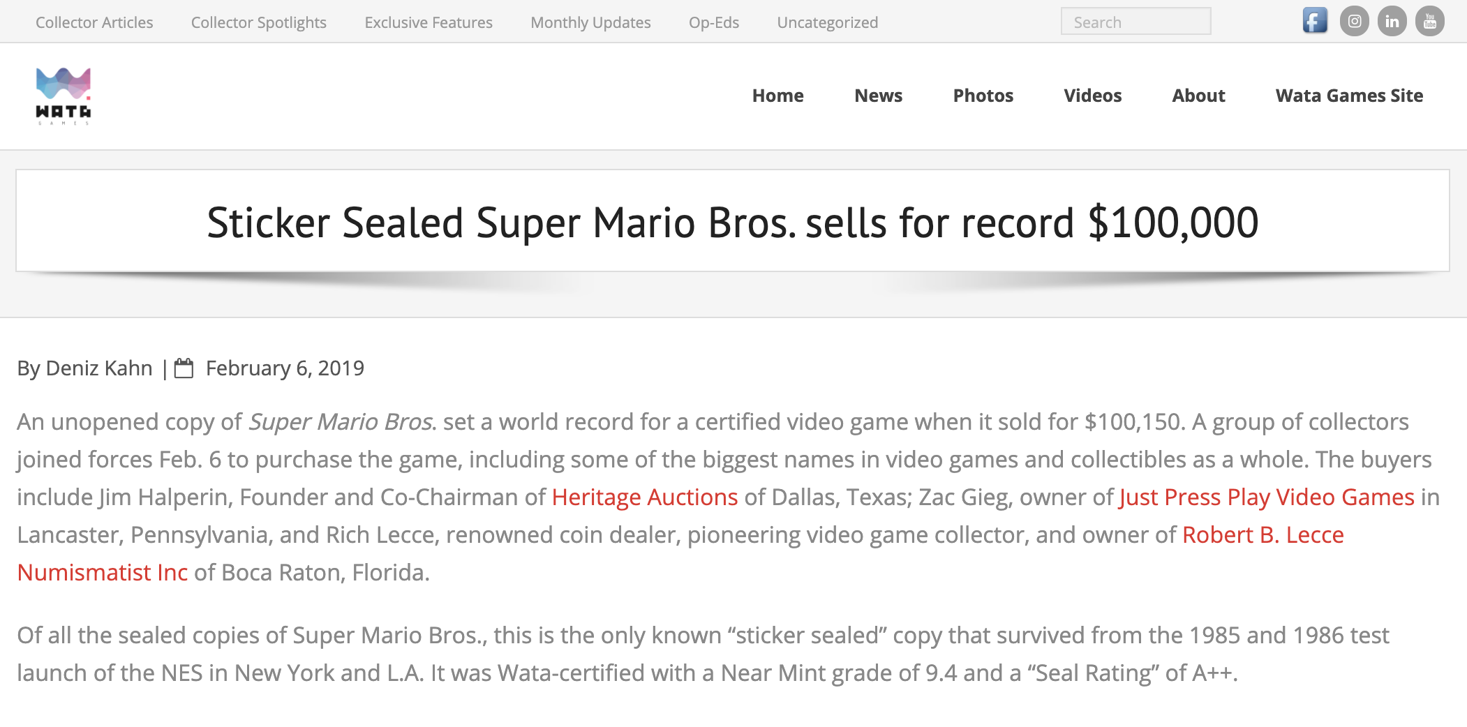 This announcement by Heritage was misleading in the extreme, however. It identified Kenneth Thrower as a “co-founder” of WATA, but Lecce, one of Thrower’s WATA co-founders (per Lecce)—and the co-purchaser of Bronty’s game with Halperin—was said to be merely a “renowned coin dealer, pioneering video game collector, and owner of Robert B. Lecce Numismatist, Inc. of Boca Raton, Florida.” Heritage then quoted the third WATA co-founder, Deniz Kahn, without identifying either Halperin or Gieg as Kahn’s associates and advisers. And it had Kahn himself add, helpfully to the financial interests of both himself and these men with whom he was linked in undisclosed ways,