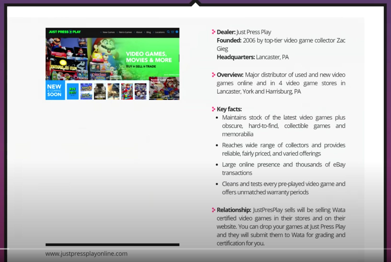 “Wata Games is a video game grading company based in Denver, Colorado that has made the transition for comic collectors joining the video game collecting realm much easier. Wata grades on a scale that is easily translatable for those who have experience in comic book grading. But, more so, Wata was born out of the love for the hobby and a glaring need for a new grading company. They are taking what they have learned in the last couple decades and building a force in the video game collecting scene. As of January 2020 Wata Games estimates that the majority of those who buy their graded games through Heritage Auctions are these ‘new collectors’ [who have caused ‘prices…[to] soar’].”